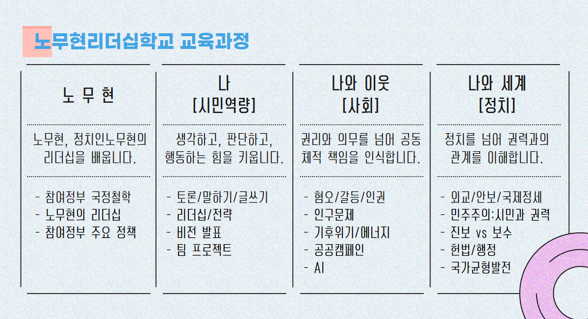 일정 2026년 3월 7일~6월 27일 / (16주) / 매주 토요일 13시~18시(5시간)- 입학워크숍 3/7(토)-8(일) 1박 2일 봉하마을 (★필수)- 평화워크숍 6/20(토)-6/21(일) 1박 2일 강원도 인제군 (★필수)장소 노무현시민센터 (종로구 창덕궁길 73 / 안국역) 1층 다모여 강의실대상 정치적 사고와 행동하는 시민으로 성장하고자 하는 청·장년모집인원 35명 이내교육비 120만원 / 후원회원 100만원- 만 39세 이하(86년 3월 이후 출생) 청년은 노무현재단 회원의 후원금으로 교육비를 100% 지원합니다.- 지역할인 : 최대 30% (지역별 차등 할인 적용)