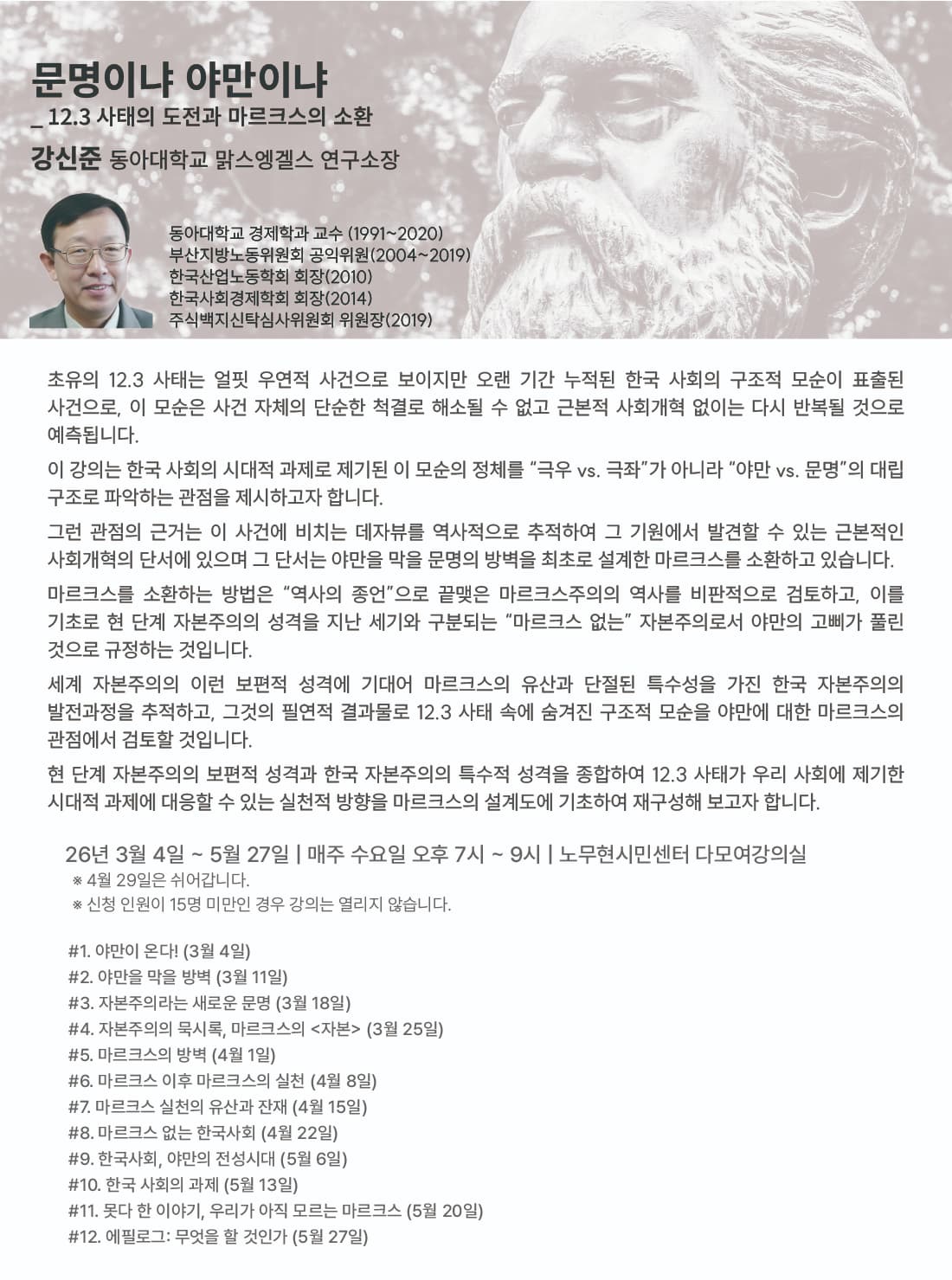 강의주제 문명이냐 야만이냐 – 12.3 사태의 도전과 마르크스의 소환 강신준 동아대학교 맑스엥겔스연구소장 26년 3월 4일 ~ 5월 27일 매주 수요일 오후 7시 ~ 9시 노무현시민센터 다모여강의실 #1. 야만이 온다! (3월 4일) #2. 야만을 막을 방벽 (3월 11일) #3. 자본주의라는 새로운 문명 (3월 18일) #4. 자본주의의 묵시록, 마르크스의 <자본> (3월 25일) #5. 마르크스의 방벽 (4월 1일) #6. 마르크스 이후 마르크스의 실천 (4월 8일) #7. 마르크스 실천의 유산과 잔재 (4월 15일) #8. 마르크스 없는 한국사회 (4월 22일) #9. 한국사회, 야만의 전성시대 (5월 6일) #10. 한국 사회의 과제 (5월 13일) #11. 못다 한 이야기, 우리가 아직 모르는 마르크스 (5월 20일) #12. 에필로그: 무엇을 할 것인가 (5월 27일)