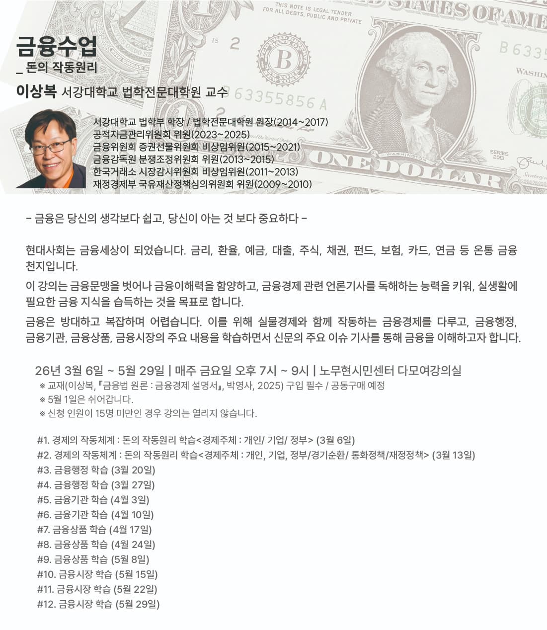 강의주제 금융수업 – 돈의 작동원리 이상복 서강대학교 법학전문대학원 교수 26년 3월 6일 ~ 5월 29일 매주 금요일 오후 7시 ~ 9시 노무현시민센터 다모여강의실 #1. 경제의 작동체계 : 돈의 작동원리 학습<경제주체 : 개인/ 기업/ 정부> (3월 6일) #2. 경제의 작동체계 : 돈의 작동원리 학습<경제주체 : 개인, 기업, 정부/경기순환/ 통화정책/재정정책> (3월 13일) #3. 금융행정 학습 (3월 20일) #4. 금융행정 학습 (3월 27일) #5. 금융기관 학습 (4월 3일) #6. 금융기관 학습 (4월 10일) #7. 금융상품 학습 (4월 17일) #8. 금융상품 학습 (4월 24일) #9. 금융상품 학습 (5월 8일) #10. 금융시장 학습 (5월 15일) #11. 금융시장 학습 (5월 22일) #12. 금융시장 학습 (5월 29일)